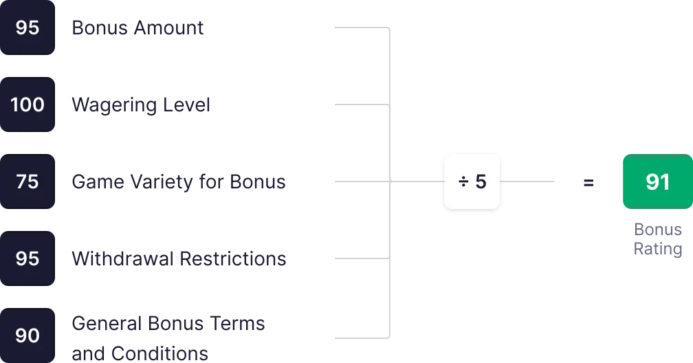 | Om kasinot erbjuder bonusar (välkomstbonus och exklusiv bonus utan insättning) med låga eller genomsnittliga krav. | 100 |