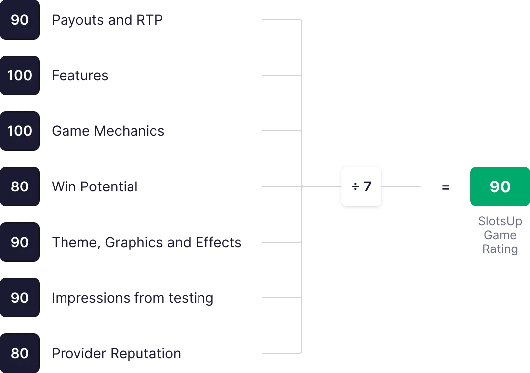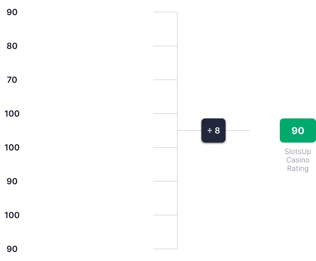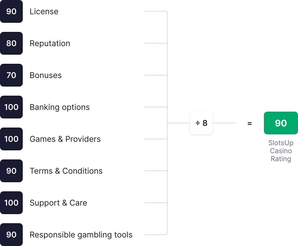 SlotsUp Casino-betyget beräknas utifrån åtta nyckelvärden, som var och en poängsätts från 0 till 100. Dessa poäng summeras, genomsnittsberäknas och används för att fastställa det slutliga totalbetyget.