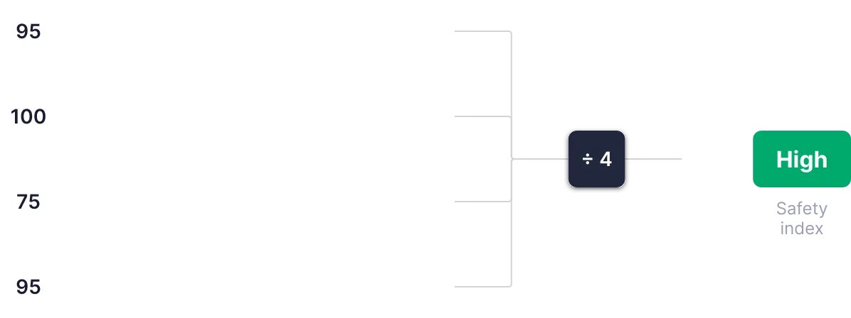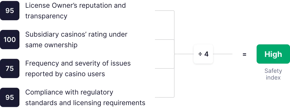 Vi bedömer ett kasinos säkerhet utifrån fyra kriterier (två individuella och två sammanhängande), som var och en poängsätts från 0 till 100. Poängen summeras sedan, genomsnittet beräknas och används för att fastställa det slutliga säkerhetsindexet.